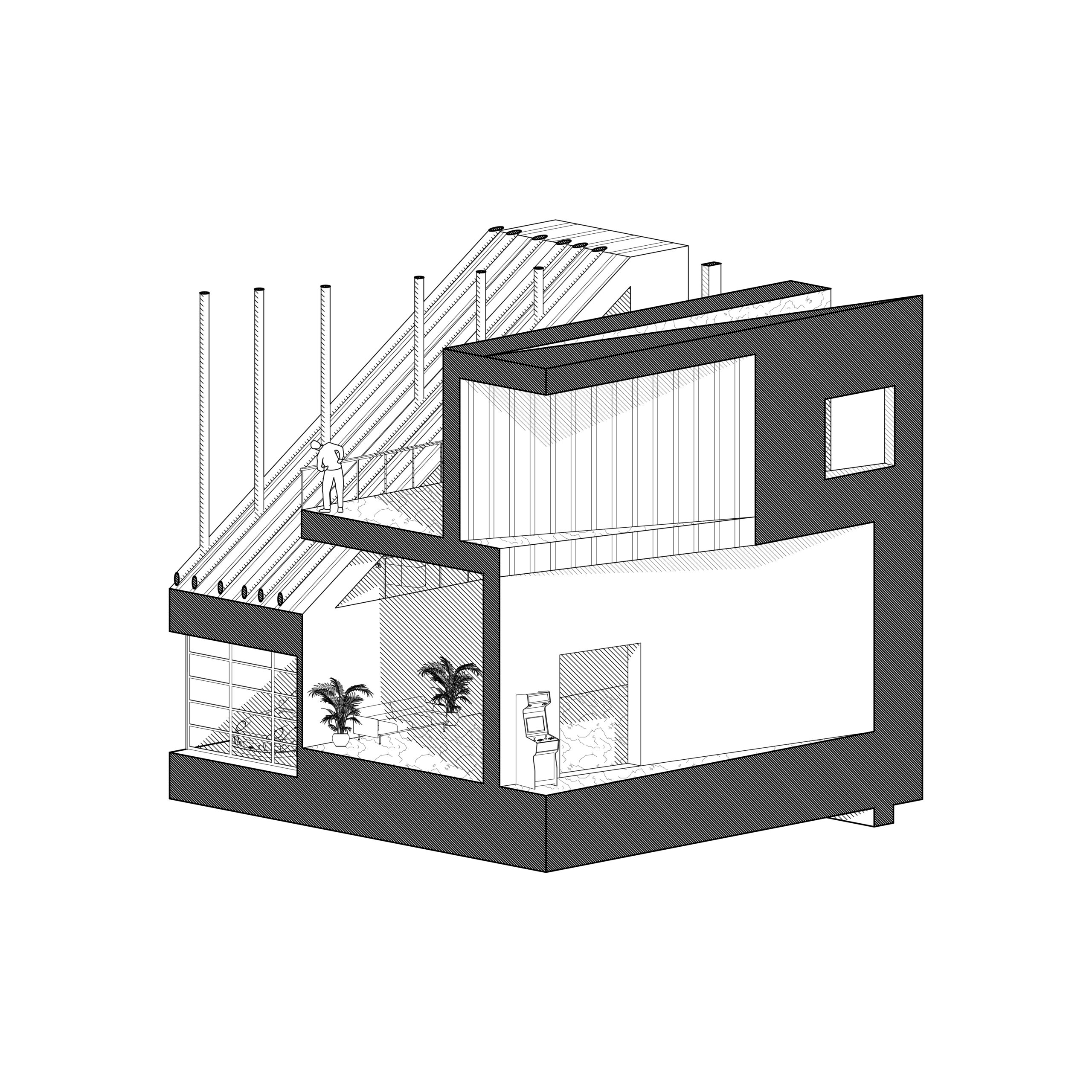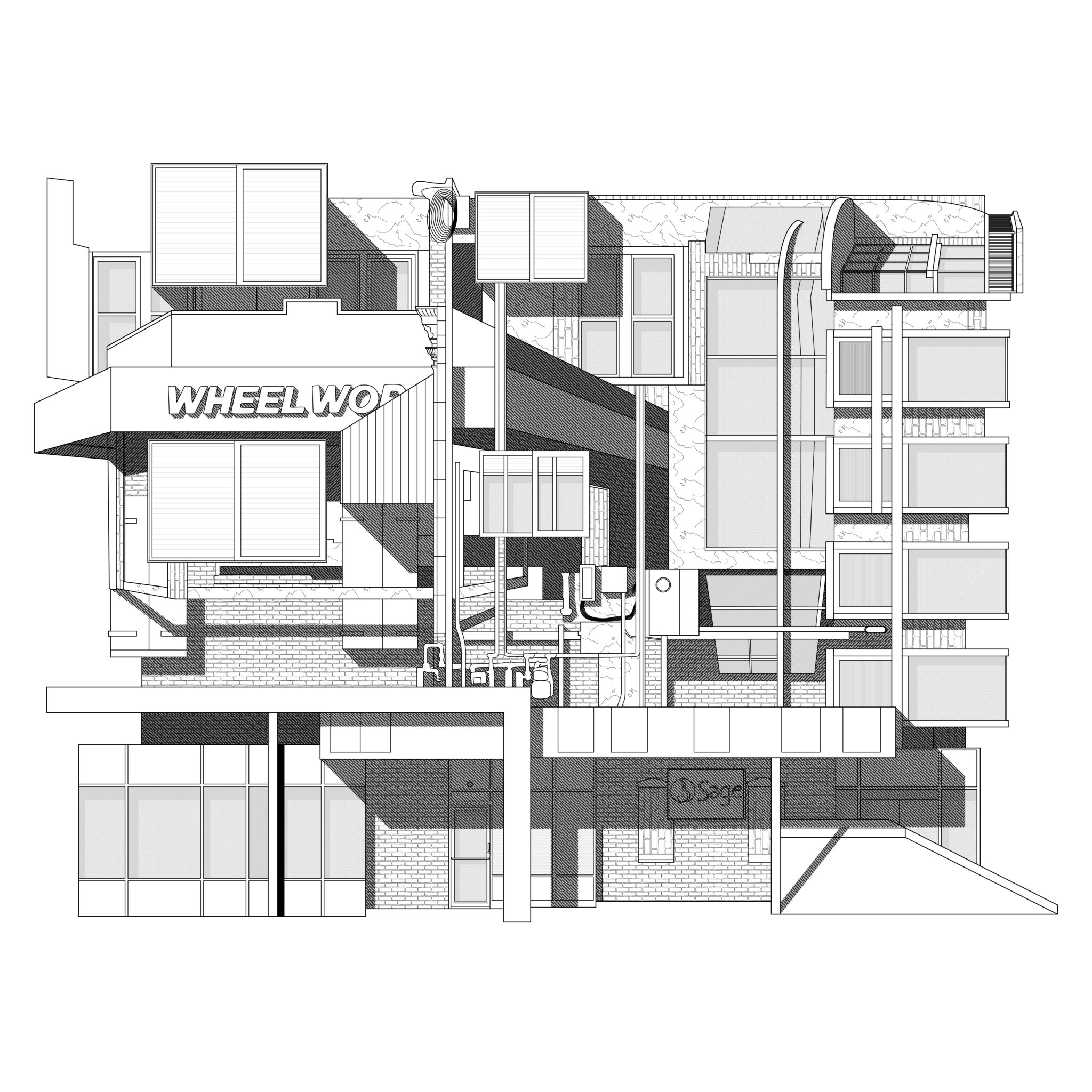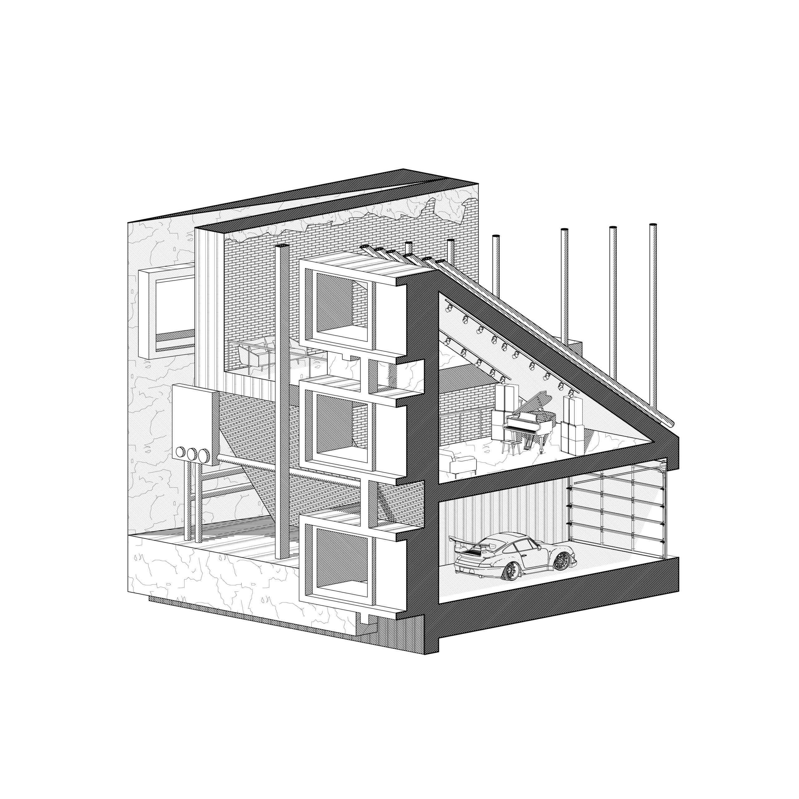 The subsequent phase involved providing a new context for this collage. I created two volumetric isometric section cuts from the drawing, incorporating entourage elements. The amalgamation of apartment buildings, storefronts, and office buildings seamlessly transformed into a unified studio building.